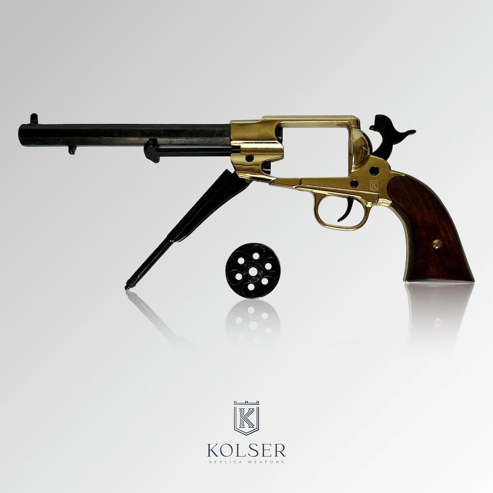 A medida que los revólveres de avancarga quedaban obsoletos, muchos modelos fueron adaptados para utilizar cartuchos metálicos. Kolser recrea con precisión el Remington Converted 1858, con un tambor adaptado y percutor posterior. Esta réplica no es solo decorativa: está diseñada con un mecanismo funcional que reproduce los movimientos del arma original, incluyendo un sistema de disparo simulado.
