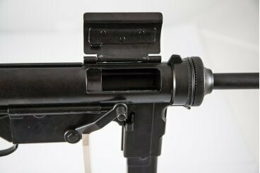 Reproducción de subfusil, fabricado en metal, con mecanismo simulador de carga y disparo, tapa móvil de seguro, cargador extraíble y culata retráctil con doble posición.
